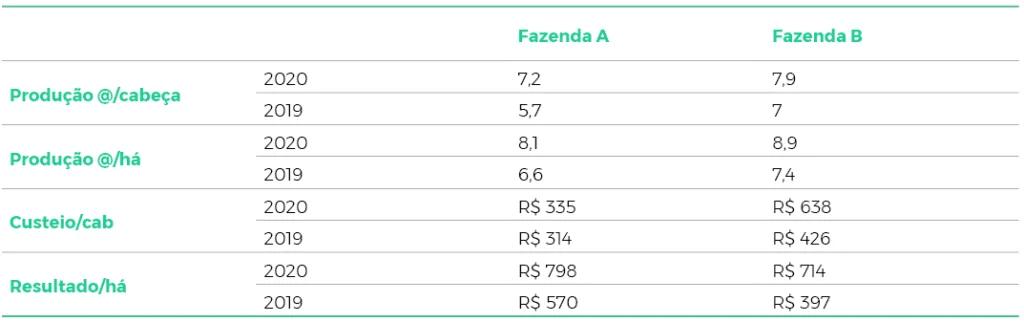 Analisando os resultados, podemos observar que como era o esperado, a fazenda “B” tem maior produção de @ por cabeça e por ha, e também um custo maior, visto que a parte de nutrição é mais representativa, mas o resultado foi inferior a fazenda “A”.